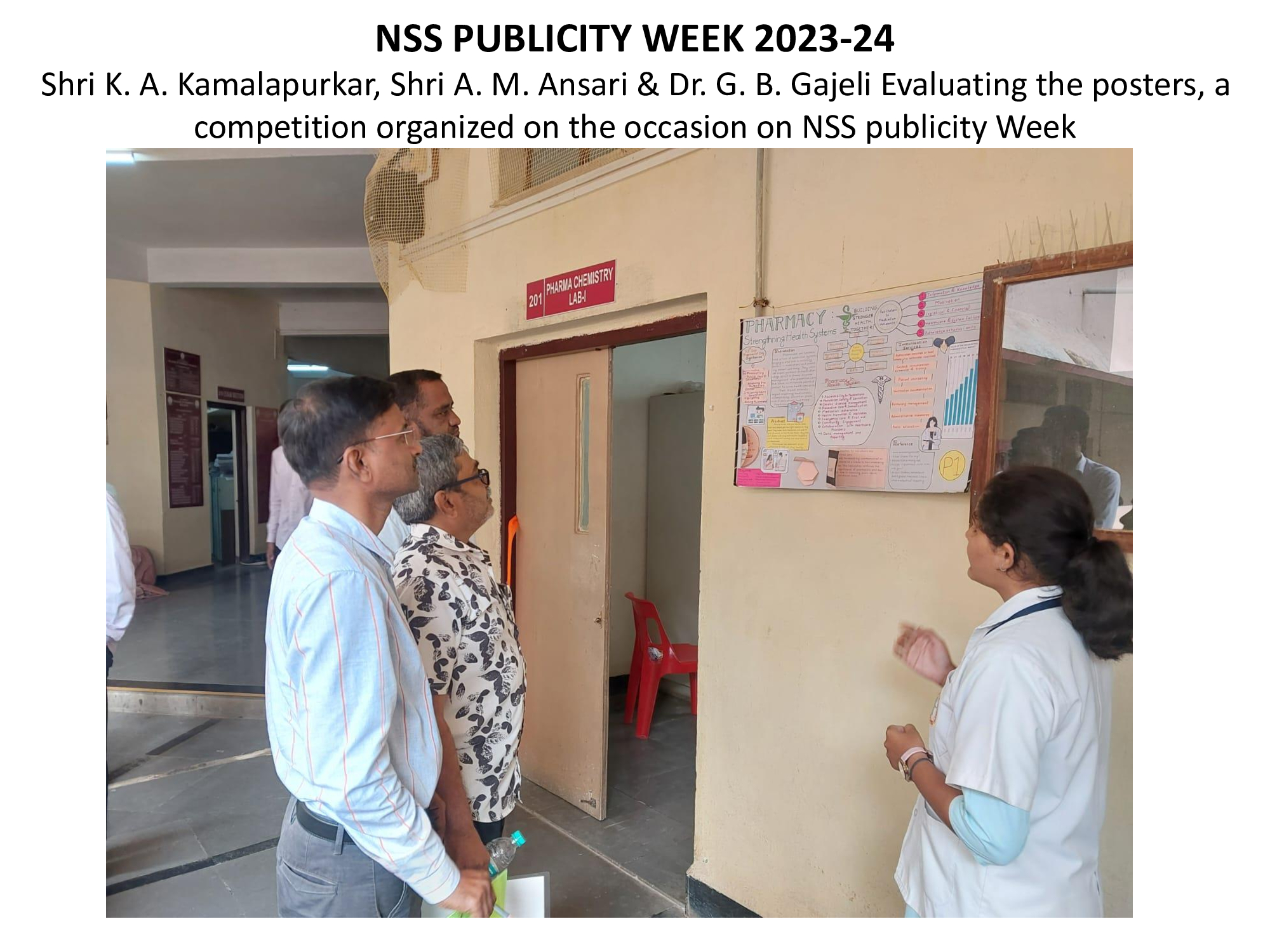 D.S.T.S. Mandal’s, College of Pharmacy, Solapur D.S.T.S. Mandal's College of Pharmacy, Shivdare Campus, Jule Solapur-1, Vijapur Road, Solapur, Maharashtra, IndiaShri K. A. Kamalapurkar, Shri A. M. Ansari & Dr. G. B. Gajeli Evaluating the posters, a competition organized on the occasion on NSS publicity Week