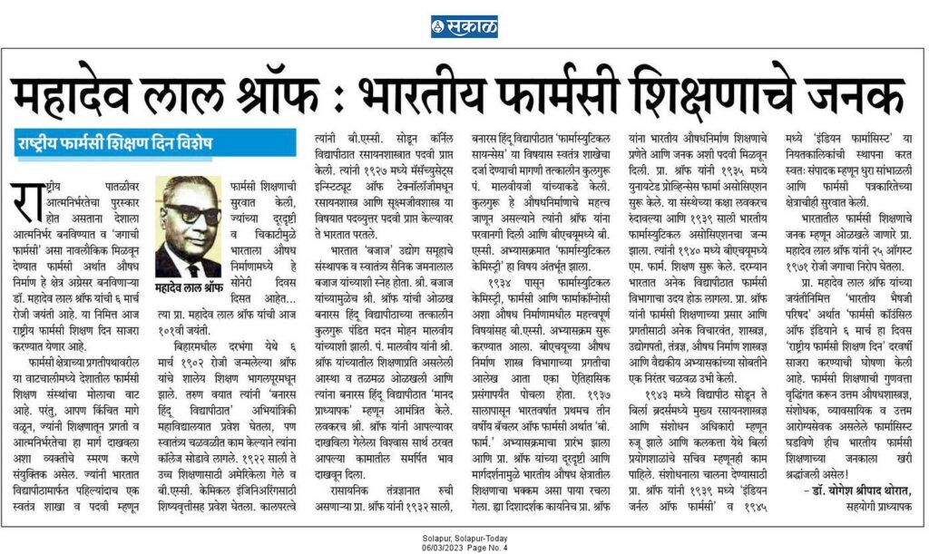 Article by Dr. Yogesh Thorat - Sakal (06.03.2023)