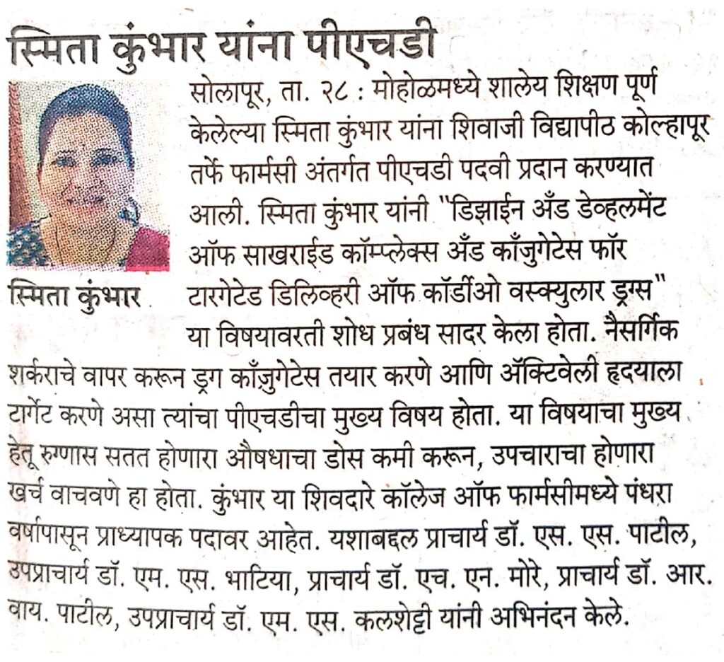 PhD. Awarded to Ms. S.T. Kumbhar (29.05.2022)